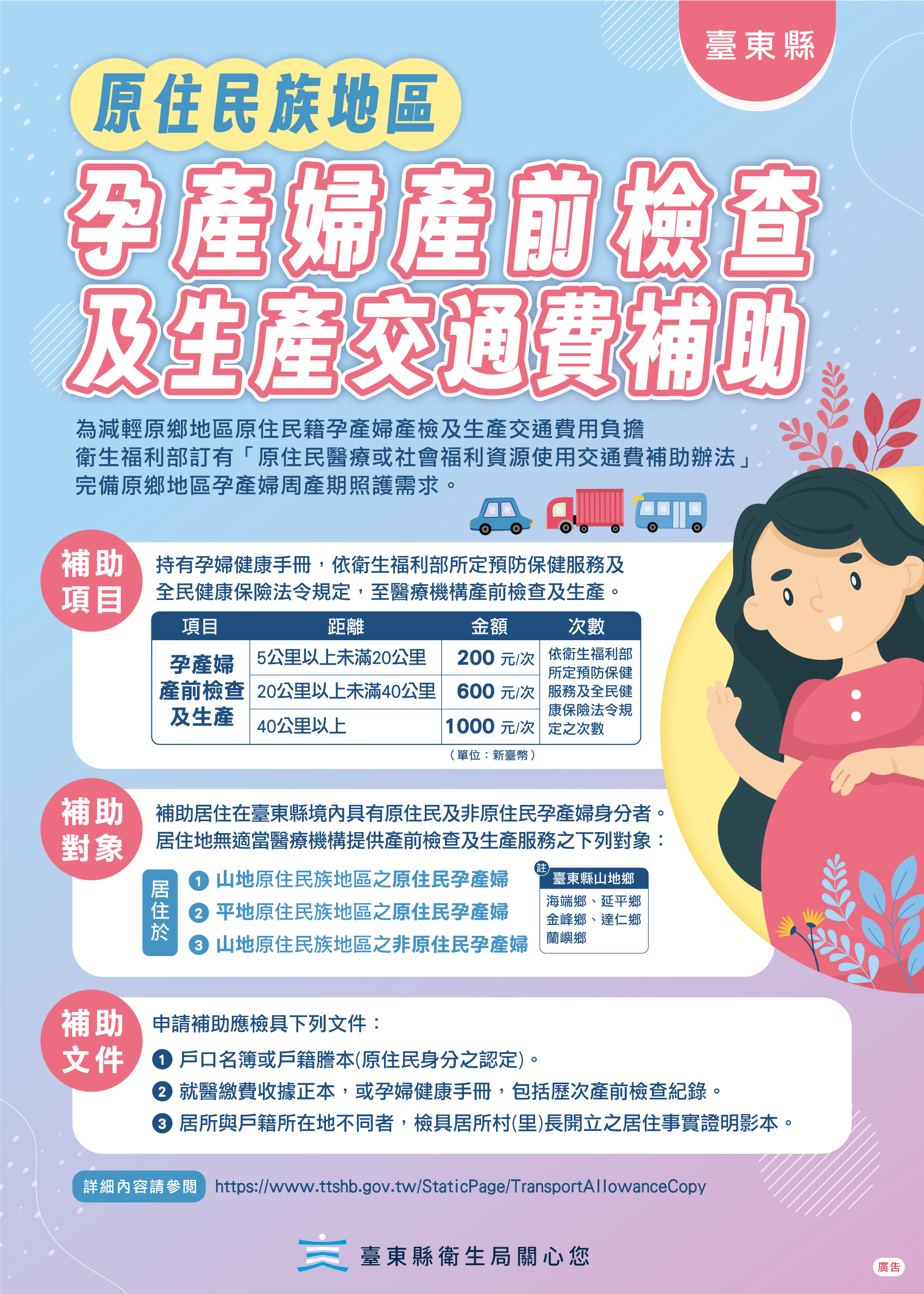 為了您的權益,請記得向轄區衛生所申請原住民就醫交通補助費。詳情請上臺東縣衛生局網站(https://www.ttshb.gov.tw/StaticPage/TransportAllowanceCopy)。 |