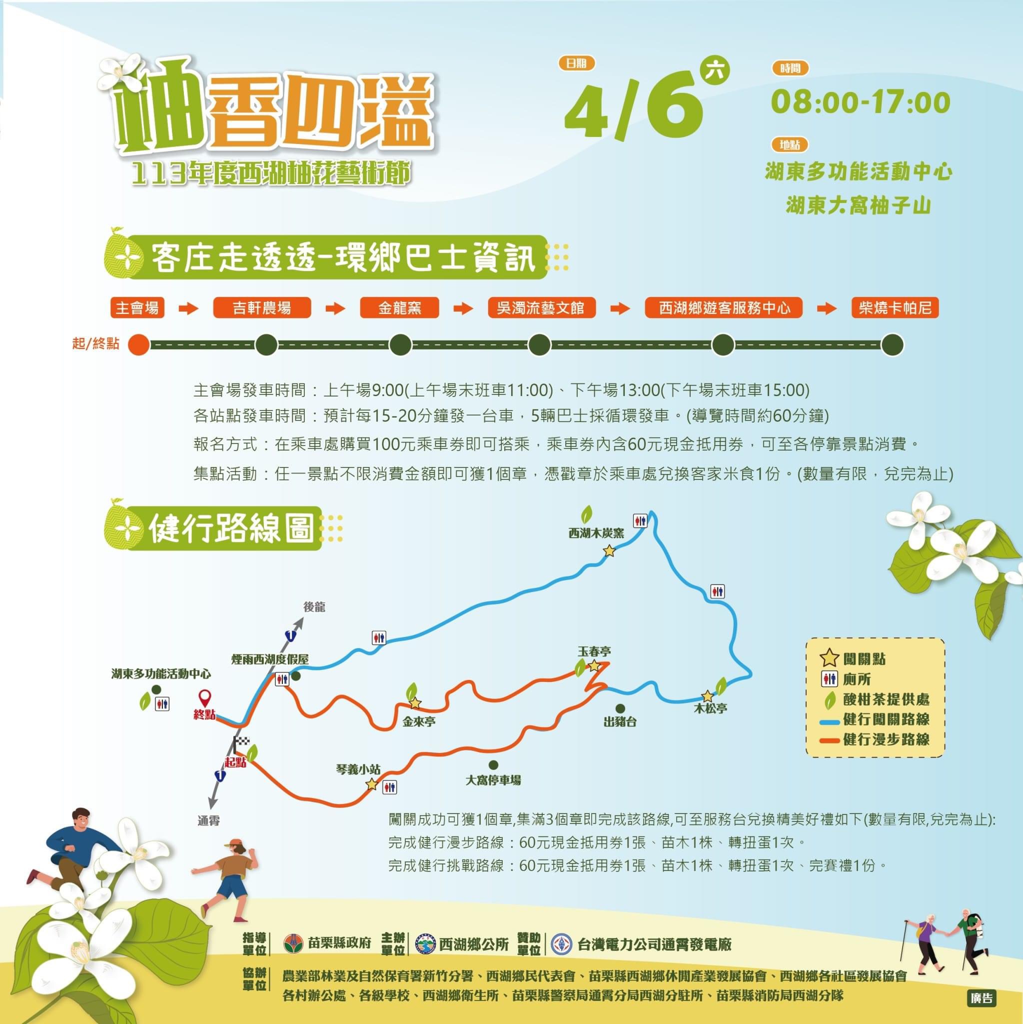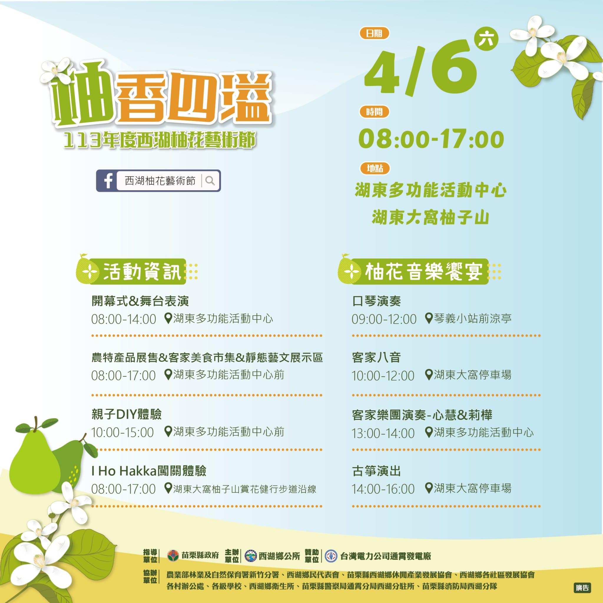 轉知苗栗縣西湖鄉公所檢送本所辦理113年度「西湖柚花藝術節」活動宣傳DM, 敬請協助宣導所轄周知,並竭誠歡迎蒞臨指導,至紉公誼。 請民眾參閱 Attachments: 0002774_IMG_1121 (1).JPG[ ]427 kB 0002774_IMG_1122.JPG[ ]479 kB 苗栗縣西湖鄉公所.pdf[ ]204 kB