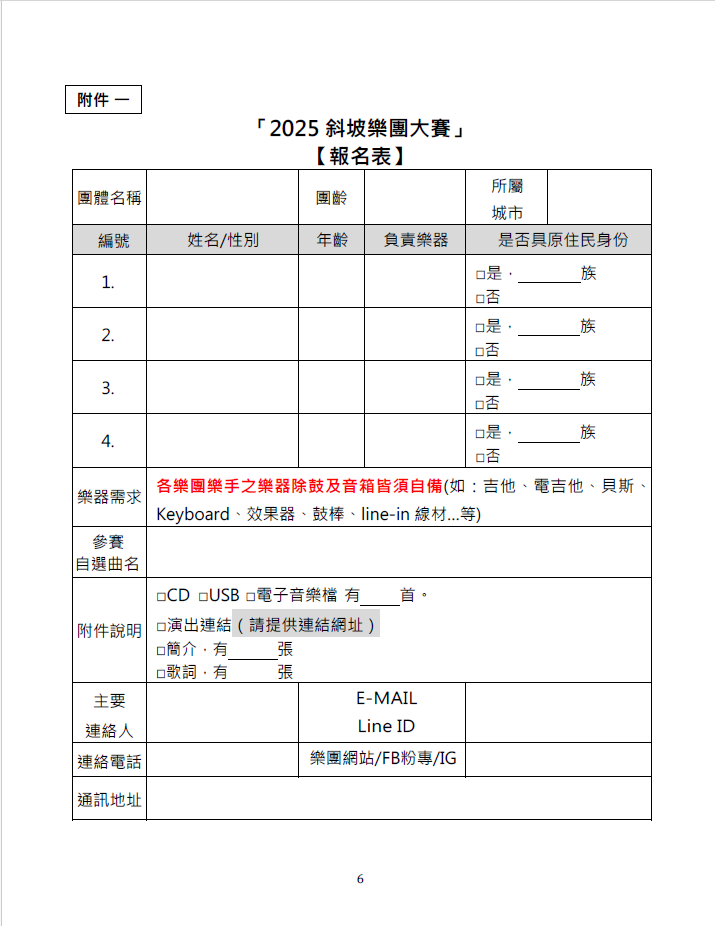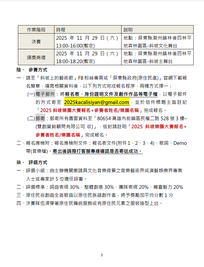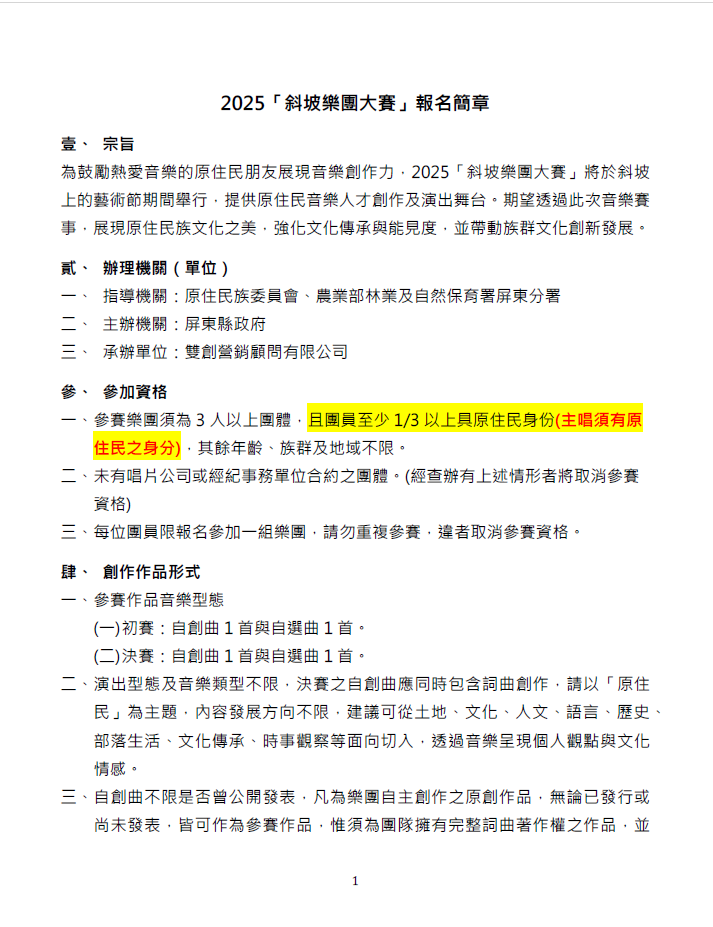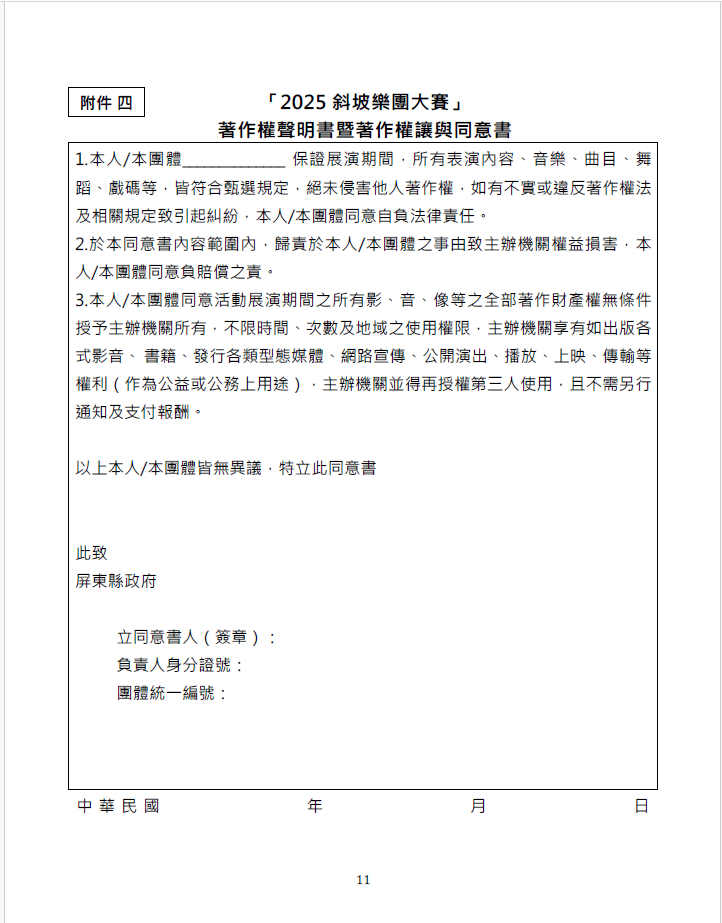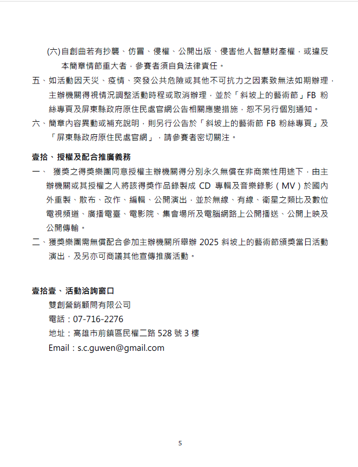 屏東縣政府辦理「2025斜坡樂團大賽簡章」一份,鼓勵所轄音樂人才踴躍報名