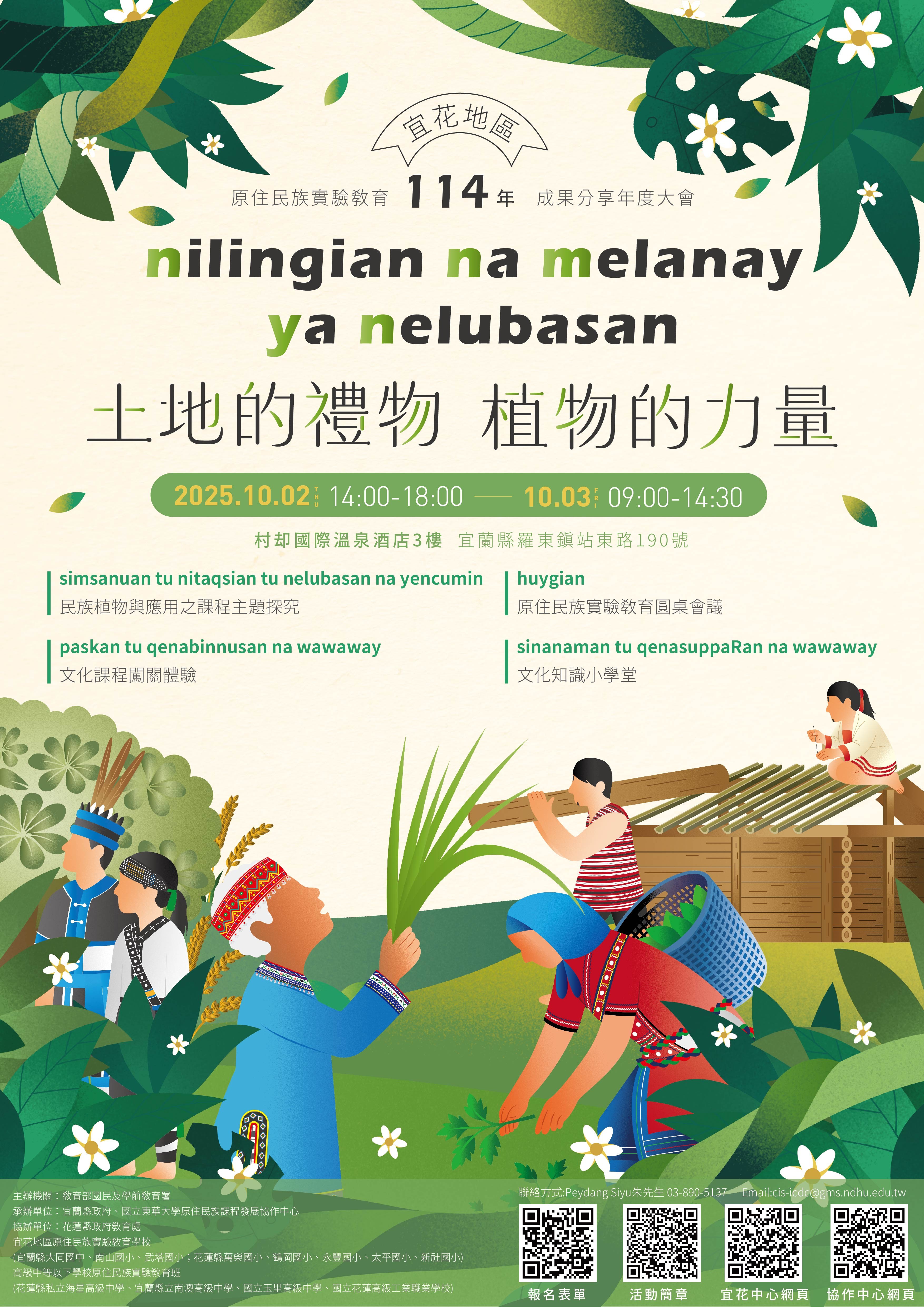 114年宜花地區原住民族實驗教育成果分享」實施計畫書及活動海報乙份 詳細資訊請見附件 Attachments: 376540000A_1140210713_ATTACH1.jpg[ ]2156 kB 376540000A_1140210713_print.pdf[ ]308 kB