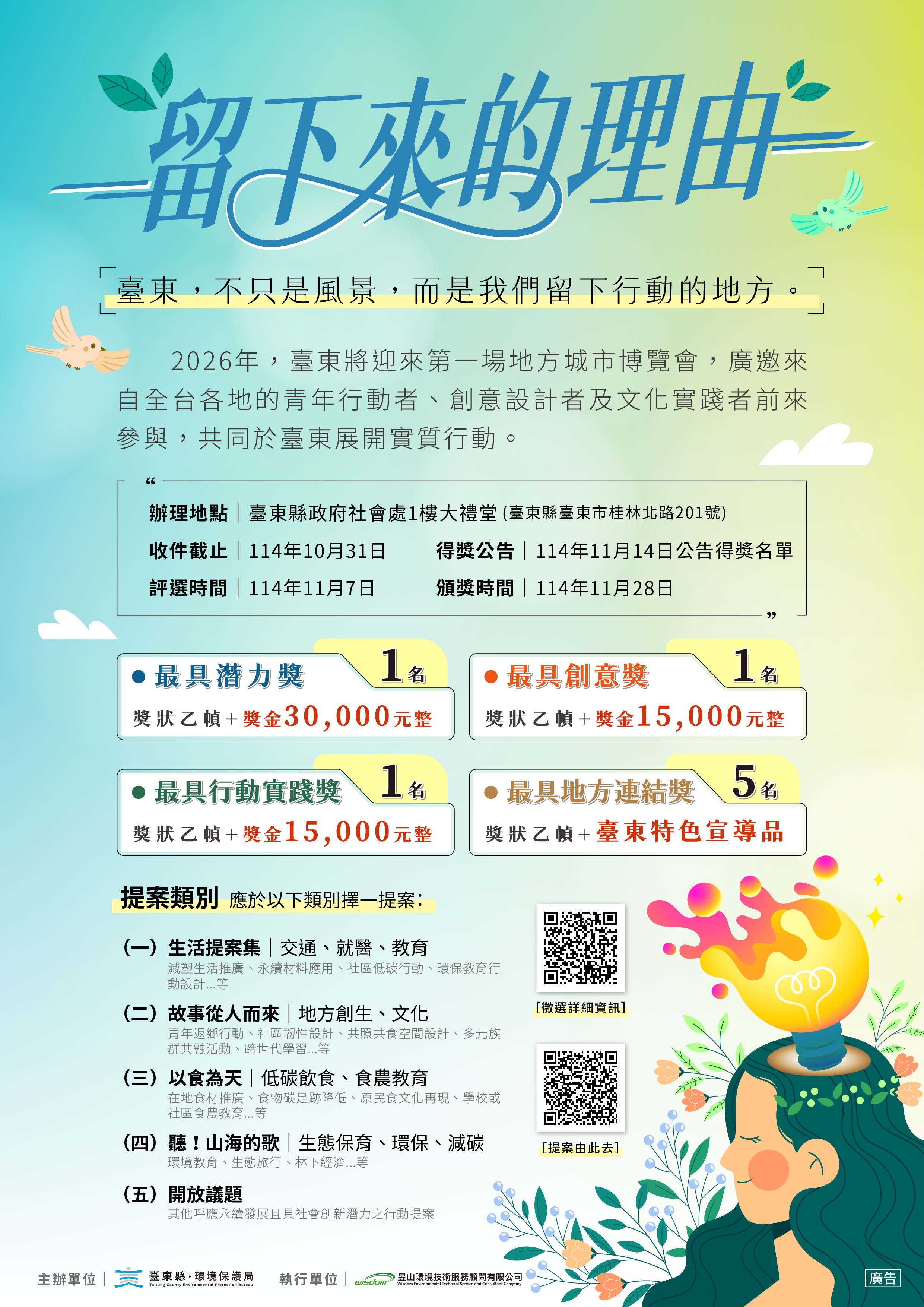 為發掘臺東在地具潛力與擴散價值之創新行動,期藉由青年或民眾創新提案,作為日後推動公民參與、地方治理及空氣污染防制等政策的重要基礎,更進一步凝聚「公民行動治理」之實踐能量。 |