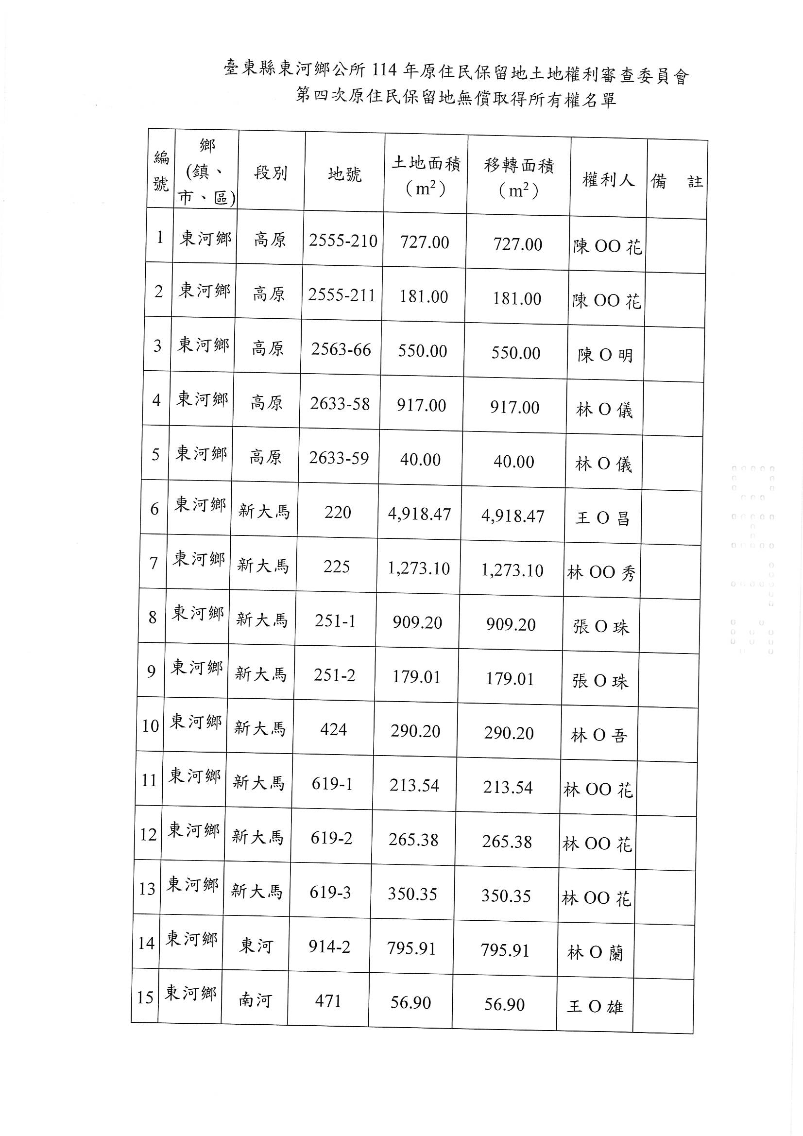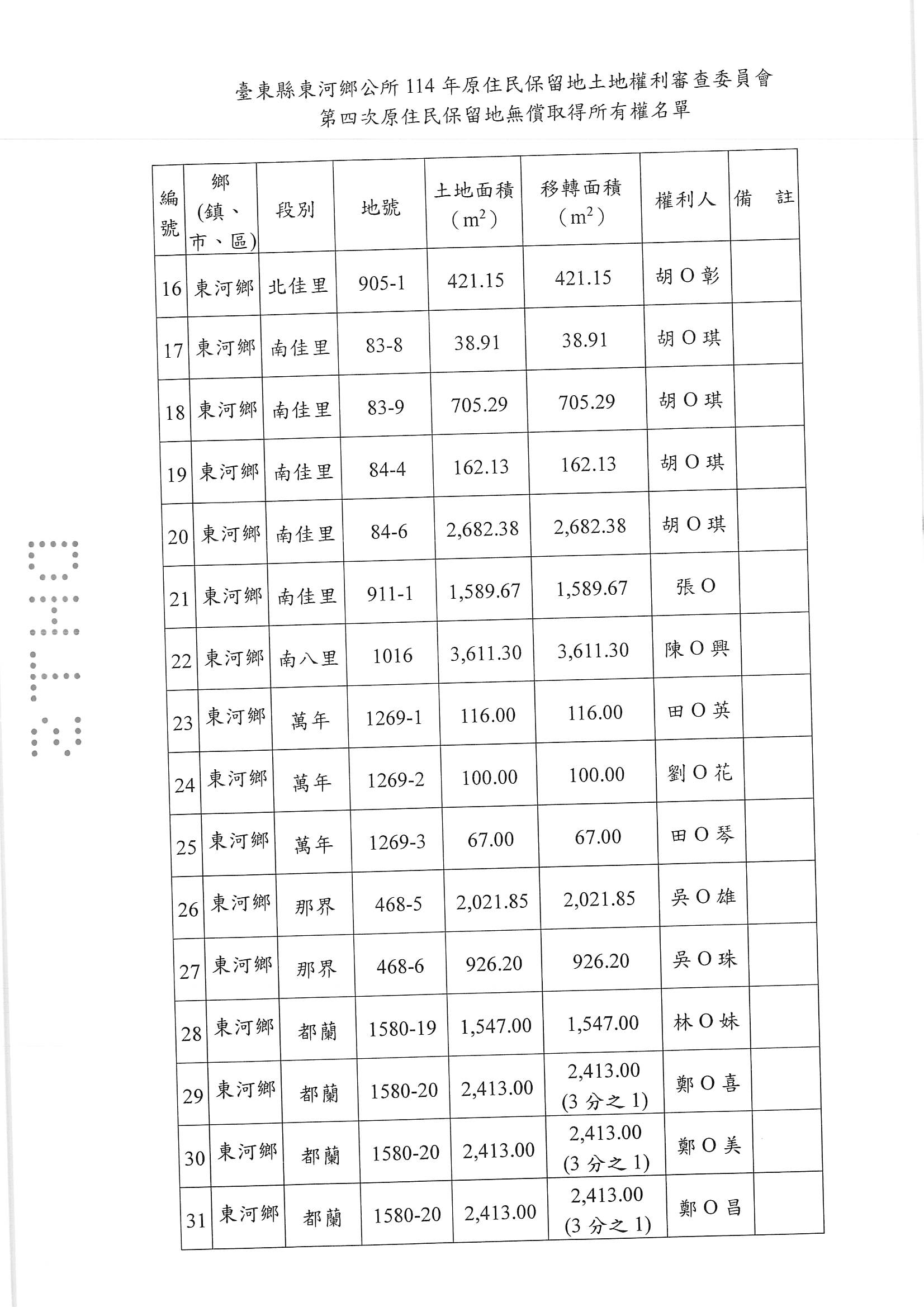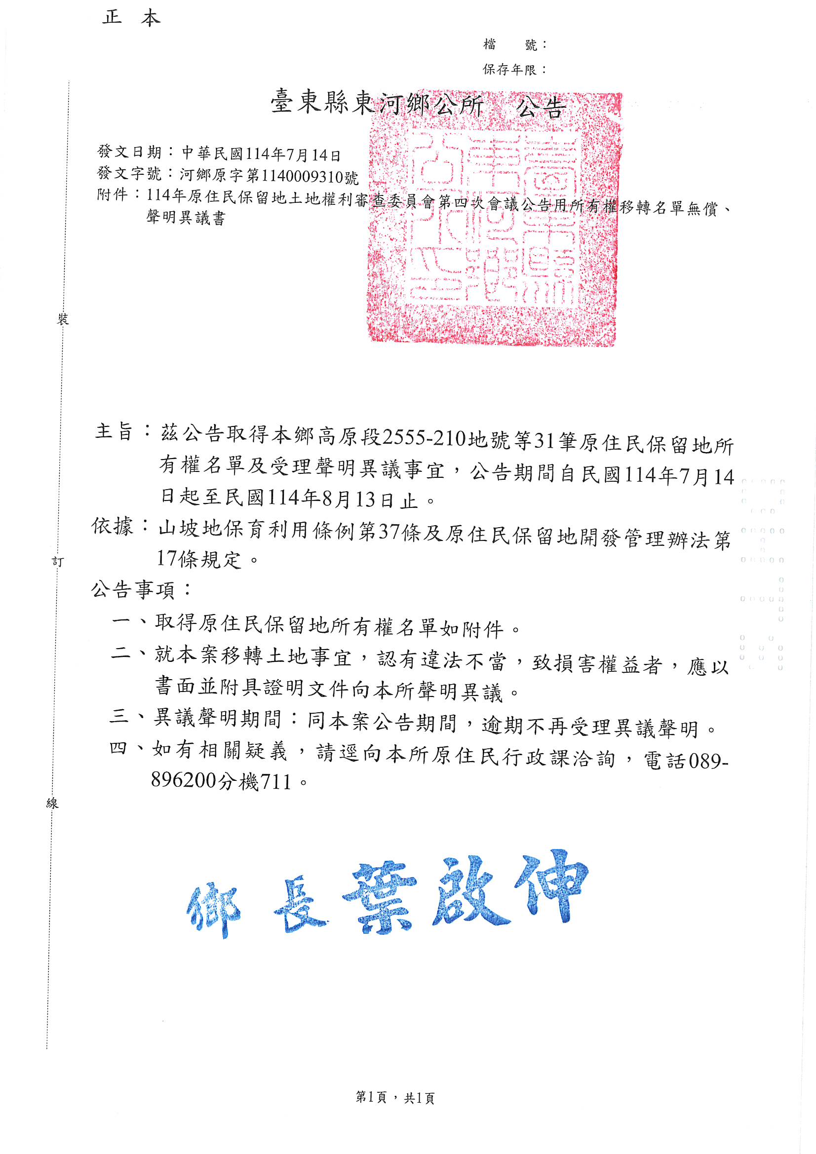 公告本鄉高原段2555-210地號等31筆原住民保留地權利回復所有權取得案。