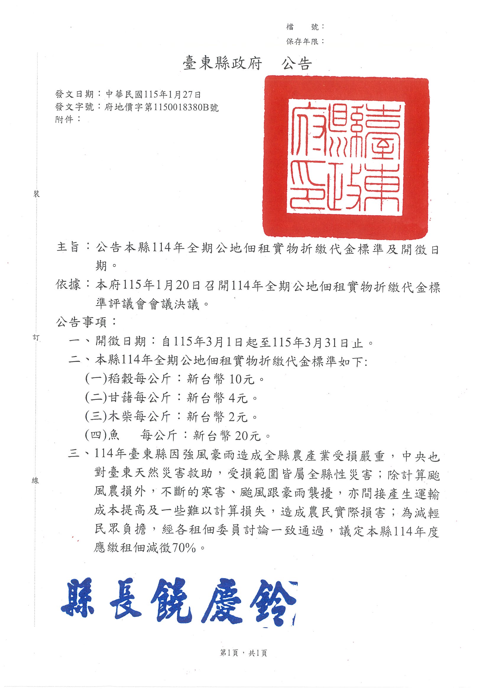 臺東縣114年全期放租公地佃租實物折繳代金標準公告